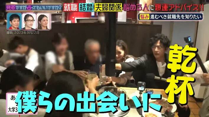 学生の1人は現在、就活中で、進むべき職業で悩んでいるとの相談を受け、レオンさんが占うことに。レオンさんが鑑定の準備をしている間、稲垣さんは「僕らの出会いに乾杯!」と笑顔で4人に混じり、池田さんとともにトークを楽しみました。