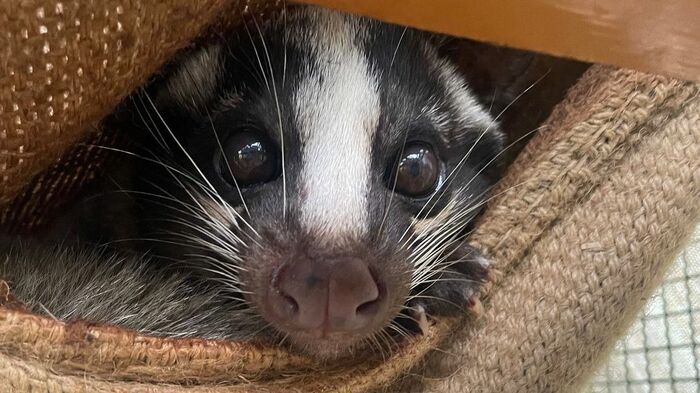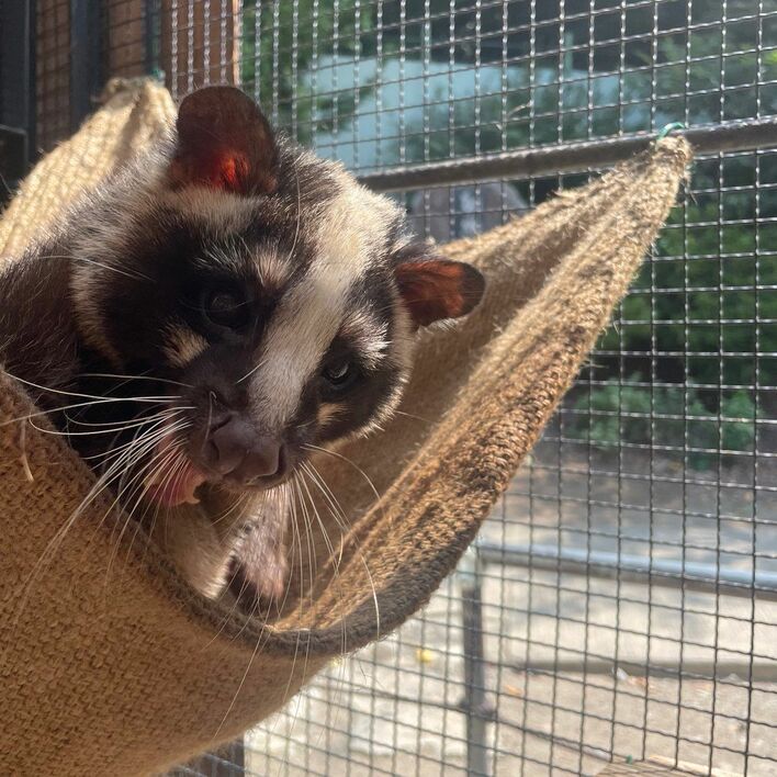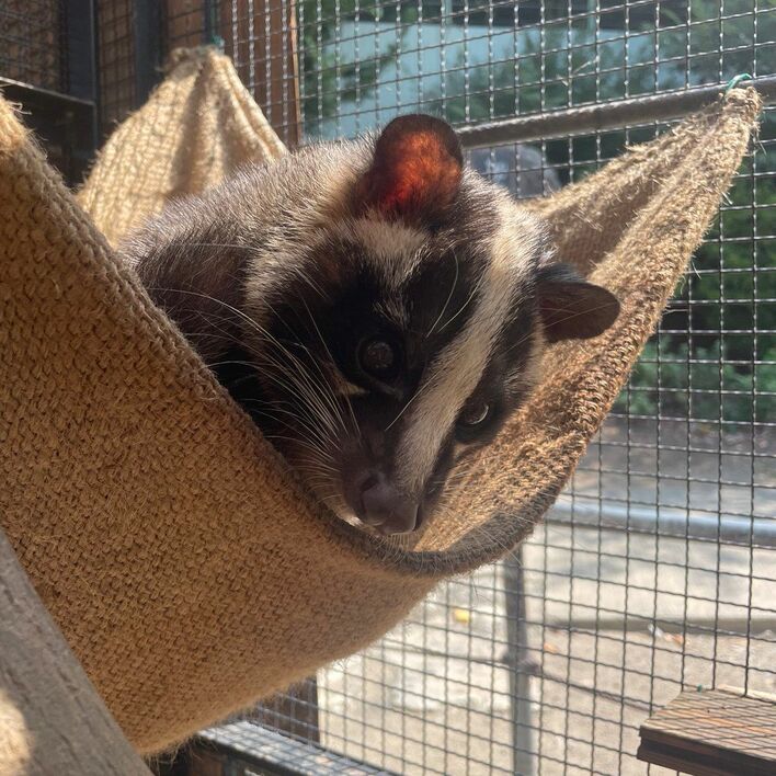 ハンモックに乗りこちらをじっと見つめる顔がかわいらしい、19歳のハクビシン「シンちゃん」。