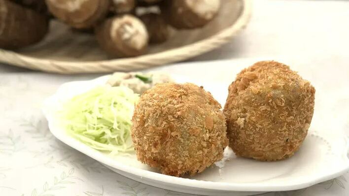 つぶした里芋に、しょうゆ、こしょう、マヨネーズを加えて、小麦粉、卵、パン粉をつけて油で揚げて“きつね色”になったら完成です。