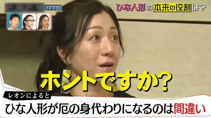 そもそも、ひな人形には“子どもの身代わり”という説がありますが、レオンさんによると「間違い。3月3日に、その女の子のために、神様が天から宿る」ものだそう。ひな人形にヒビが入った場合も、厄を取ってくれたわけではなく、「ただ壊れただけなので、修理に出したほうがいい」と説明しました。