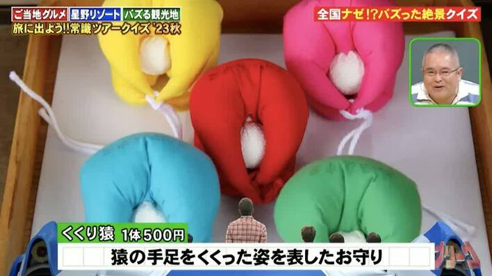 猿の手と足をくくったようなお守りで、赤、ピンク、黄色、青、緑など、とてもカラフルです。