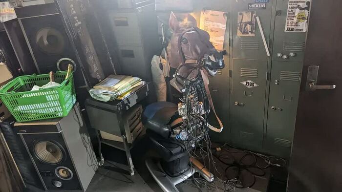 山田さんいわく、実は苦労した装飾だったそう。「演出の渋江(修平)さんから『生きた馬の首っぽいものがついた、サイバー感があるものを』という注文があり、サイバー感はところどころ切れた電球のついた電飾をつけて表現しました。馬の顔はラバーマスクをリペイントしていて、首がカクンと振るように関節を作っています」と、こだわりを。