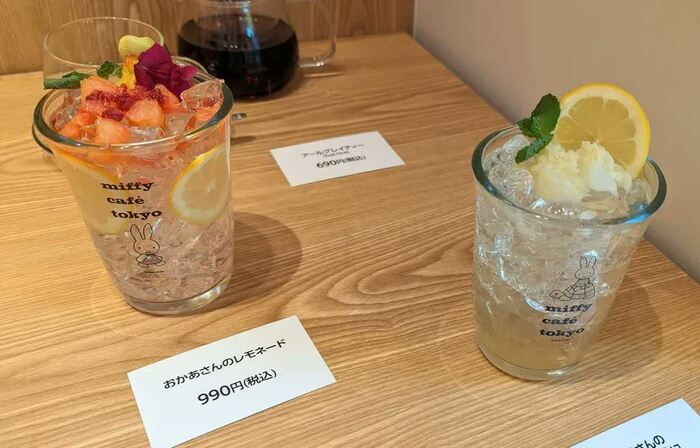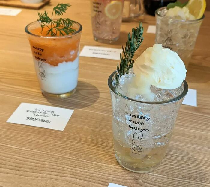 オリジナルのドリンクメニューも豊富です。絵本に登場した「おいしいなし」をイメージした「『おいしいなし』のソーダ」、ミッフィーのおかあさんをイメージした「おかあさんのレモネード」、ミッフィーのおとうさんをイメージした「おとうさんのレモンスカッシュ」、ミッフィーをイメージした「ミッフィーのキャロットヨーグルトスムージー」(各990円)。