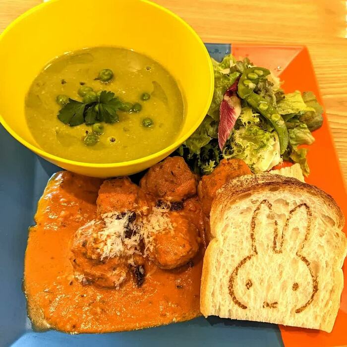 「ミートボール トマト煮プレート」(1990円)は、ゴロゴロッとしたミートボールとグリンピースをメインに煮込んだオランダ料理「エルテンスープ」のセット。パンはミッフィーの焼印が押されたホワイトブレッドか、可愛い包材でくるまれたフィセルの2種類から選べます。