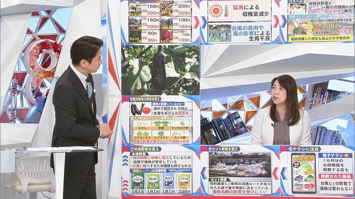 はっきりは分からないですが、暑さが落ち着いてくれば少し値段は下がってくるとは思います。ただ、台風の季節ですので、また台風が来たりすると高騰すると思いますので、そういったときには買い方を気をつけたり、代用を考えたりして、乗り切っていただきたいなと思います。