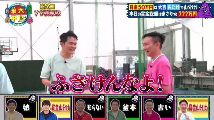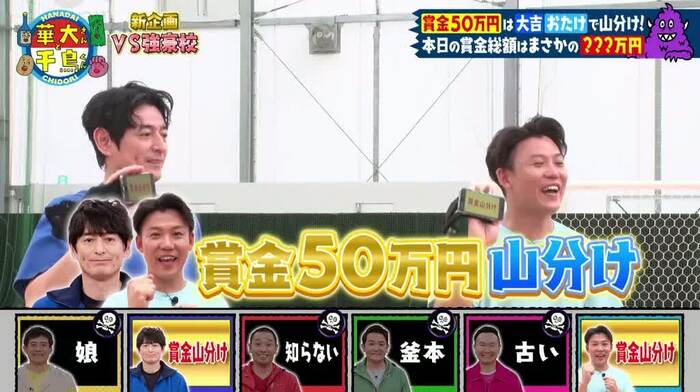 博多華丸さん、博多大吉さん、千鳥(大悟さん、ノブさん)、山内健司(かまいたち)さんを含めた6人が、さまざまな種目の強豪チームと対決しながら、条件をクリアしてより多い賞金の獲得を目指しました。