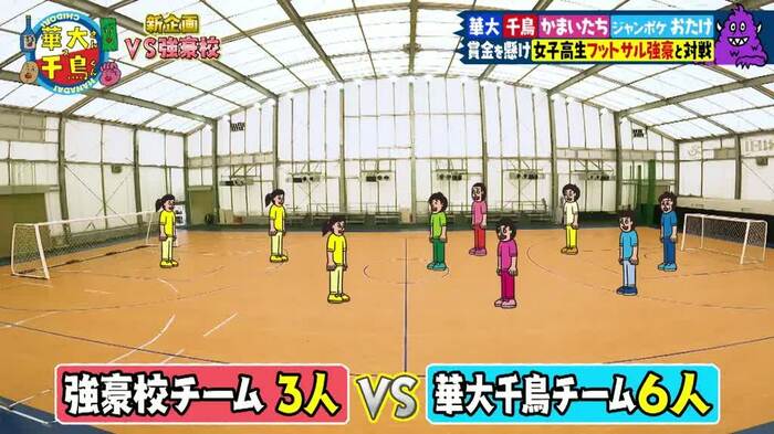 ルールは、ハンデとして試合には芸人チームは6人、強豪チームは3人が参加。強豪チームが守るゴールは、芸人チームのものより約2倍の大きさのものを使用。