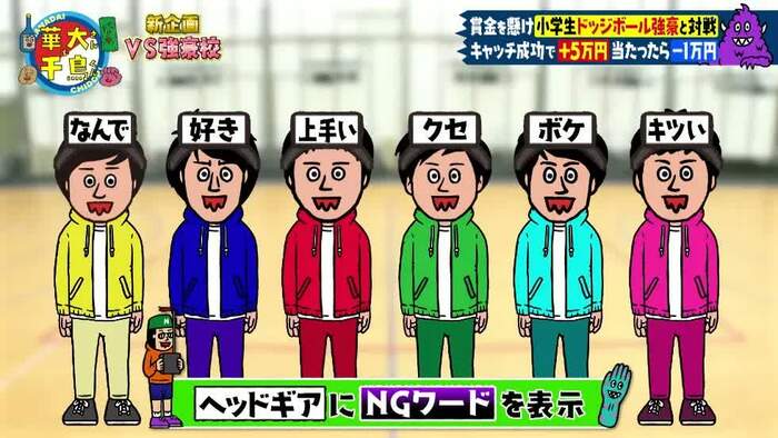 6人にはそれぞれNGワードが割り当てられており、それを2回言うと賞金山分けの権利は没収。