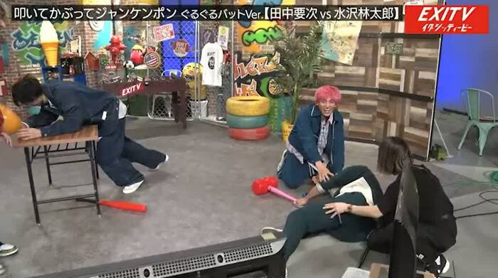 ぐるぐるバットバージョンで対決することになった2人。ジャンケンに勝った水沢さんはよろけてしまいますが、田中さんはすばやくヘルメットをかぶってセーフに。