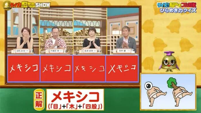 正解は「メキシコ(『目』+『木』+『四股』)。見事に全員正解。