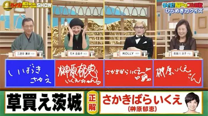 正解は「さかきばらいくえ(榊原郁恵)」。荒木さん、ROLLYさん、南美川さんの3人が正解です。