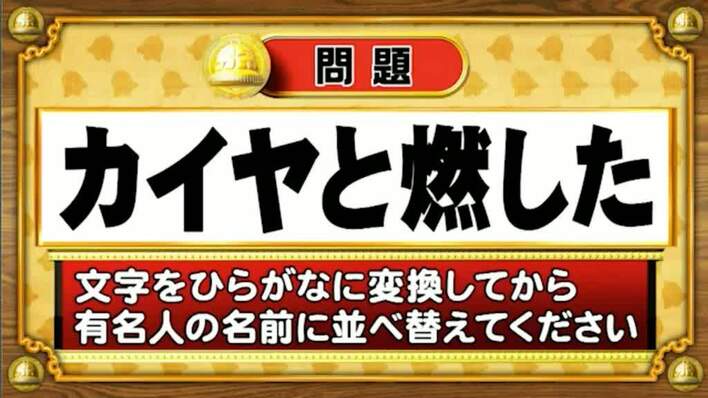 最初は、シャッフル人名の問題。次の文字をひらがなに変換してから、ある有名人の名前に並べ替えてください。