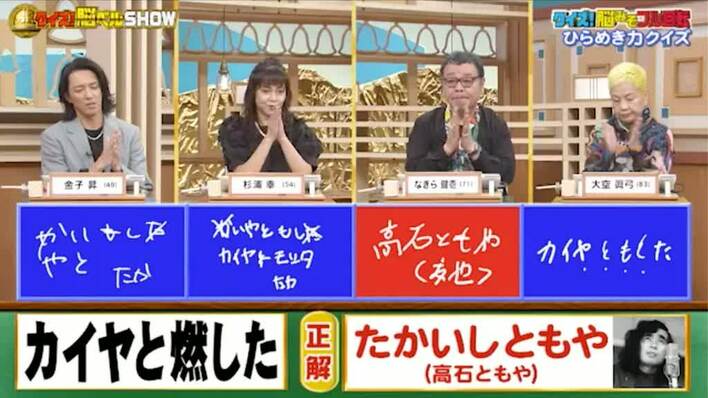 今回の解答者は、俳優・金子昇さん(49)、女優の杉浦幸さん(54)、シンガーソングライター・なぎら健壱さん(71)、女優の大空眞弓さん(83)の4名です。