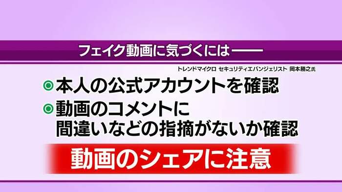 だまされないためには、「動画のコメント欄に『フェイクだ』などと見抜いている人がいるので、コメント欄もきちんと読む」「動画がどういう経緯で流れてきたのかを、しっかり見極める」ことが重要だそうで、岡本さんは「無防備に拡散に手を貸すと、自分も犯罪に加担することになるので、慎重に」と言い添えました。