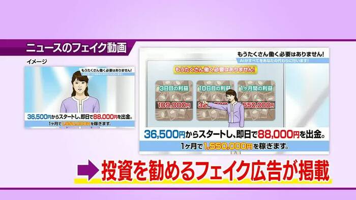 「ニュース番組の動画を加工し、アナウンサーが投資を勧めているようなフェイク広告を作った」という悪質な事例も紹介されました。