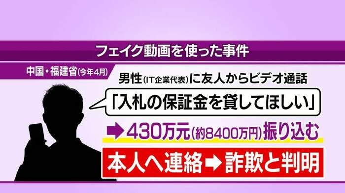 中国では、「知人からのビデオ通話に従って約8400万円を振り込んだら、フェイク動画を使った詐欺だった」というケースも報告されています。