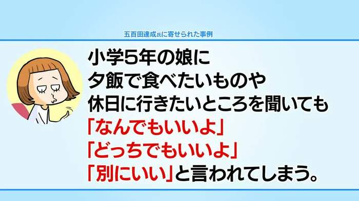 まず紹介されたのは、「小5の娘が、夕食で食べたいものや行きたいところを聞いても『なんでもいい』『別にいい』と言う」という母親の悩みです。