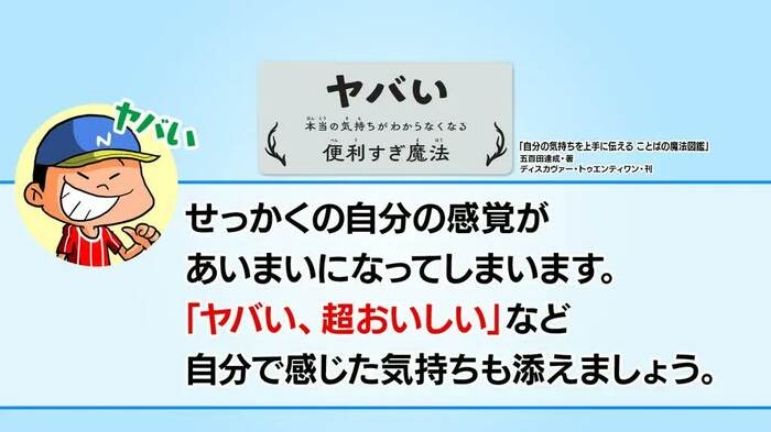 「ことばの魔法図鑑」によると、「使いすぎると感覚が曖昧になってしまうので、『ヤバい、超おいしい』など、気持ちを『ヤバい』に添えるようにする」のがよいそうです。