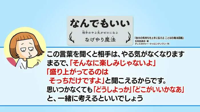 心理カウンセラーの五百田達成さんによる書籍「自分の気持ちを上手に伝える ことばの魔法図鑑」には、「なんでもいい」と言ってしまいそうなときは、「何も思いつかないとしても、『どうしようか?』と一緒に考える姿勢を見せるといい」というアドバイスが掲載されています。