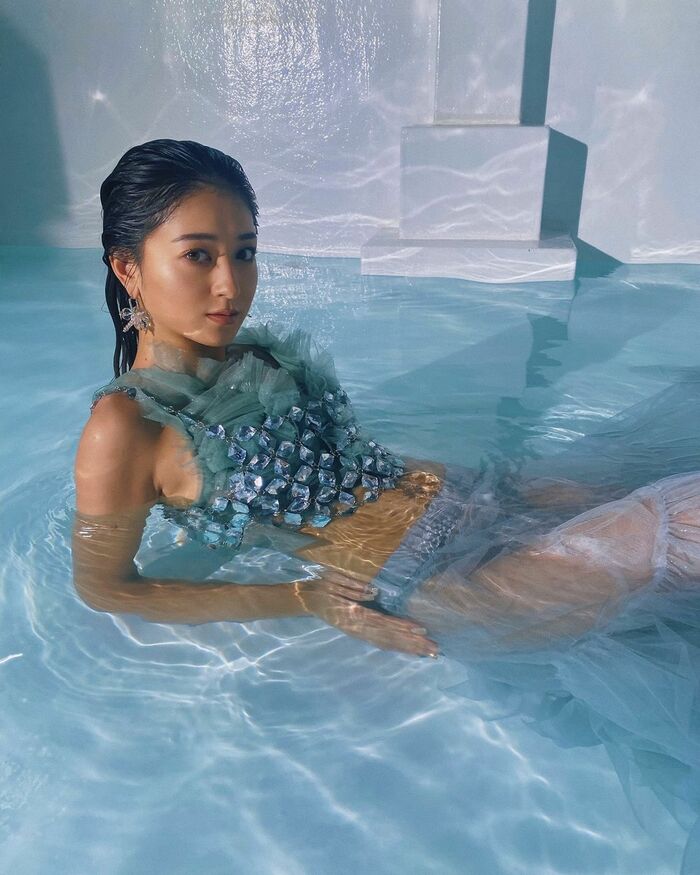 透き通った水の中で、横になるようなポーズをとり、引き締まったお腹がチラッと見えるショットが投稿されています。