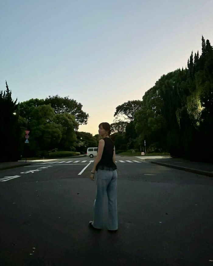 横断歩道の道路を背景に、いつもとはまた違ったカジュアルな雰囲気のスタイルを披露しました。