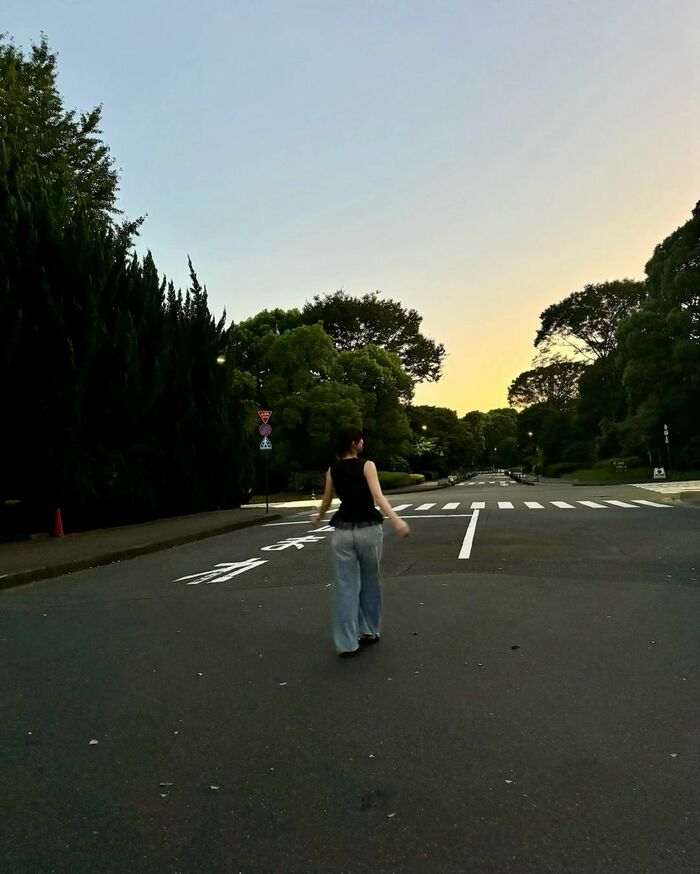 道の上を歩きながら振り返ってカメラを見つめるショットを公開しています。