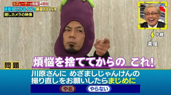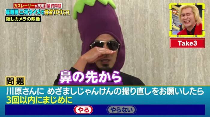 川原さんを知るカズレーザーさんは「川原さんは、ふざけることしかできないんですよ!」と予想し、「やらない」と解答。