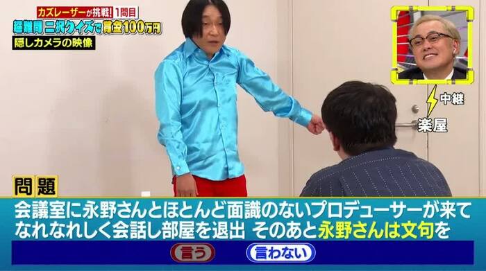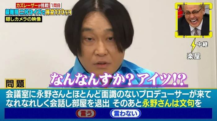 正解VTRには、永野さんの打ち合わせ中に「どうも!この間ありがとうね。二年前の、あれ良かったよ」「あ、ちょっとごめん。LINE入っちゃった」と、尊大&無礼を絵に描いたようなプロデューサーが出てきて、カズレーザーさんは「やべーの来た!マジかよ~」とあきれ顔。