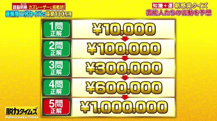 その後も、カズレーザーさんのチャレンジは続きますが、何度挑戦しても、1問目で不正解となり、5問目=100万円獲得チャンスにたどり着くことができません。