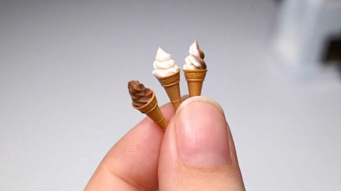 レジンを材料に、3Dモデリングをして作成したというこの作品は、デザインも少しレトロな雰囲気を感じられ、よーく見ると、ソフトクリームのコーンもピンセットでないと持てないほど小さいサイズで、思わず驚いてしまいます。