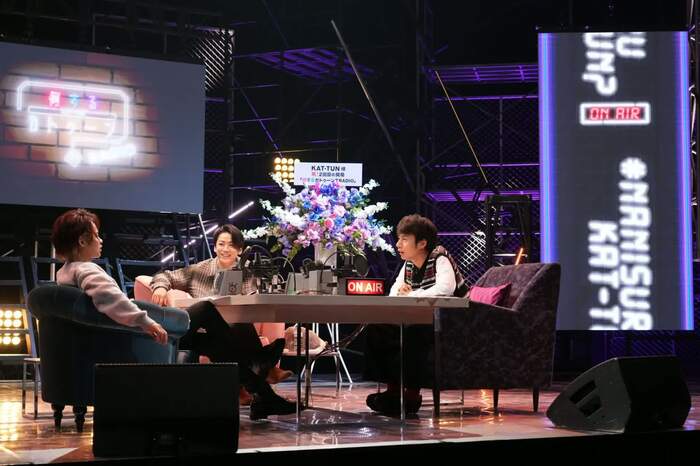 KAT-TUNがラジオ風に番組を収録する「何するラジオ」は、前回に続いて約1年半ぶり。前回は仕事の都合でお休みだった亀梨さんは、「これ、テレビなんですよ、もちろん」と中丸さんが説明しようとすると、「知ってますよ!見てましたもん」と即答。