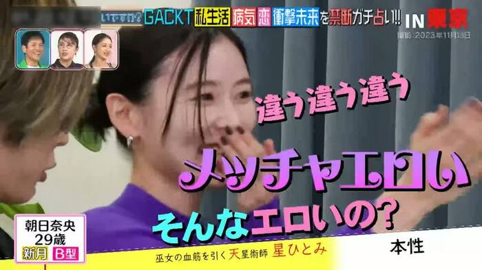 そんな朝日さんについて、星さんは「実は“夜の女王の星”を持ってます。めっちゃエロい!」と鑑定。GACKTさんが「そんなエロいの?」と食いつくと、朝日さんは「違う、違う、違う」と恥ずかしがりました。