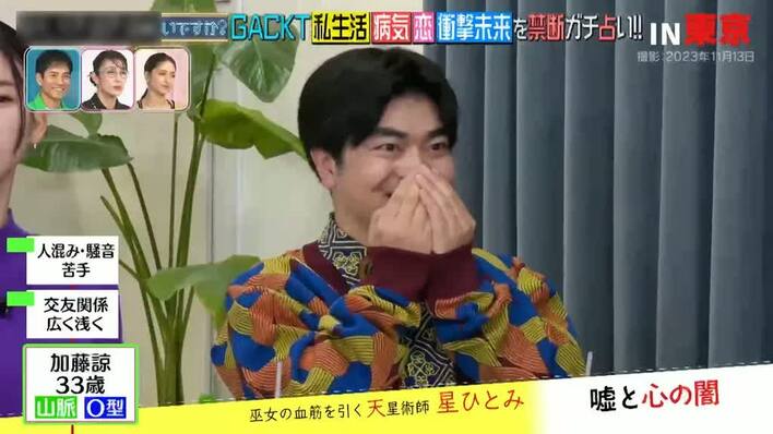 11月28日(火)放送の『突然ですが占ってもいいですか?』(フジテレビ)は、GACKTさん、加藤さん、朝日さんが、星ひとみさんに占われました。