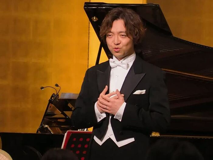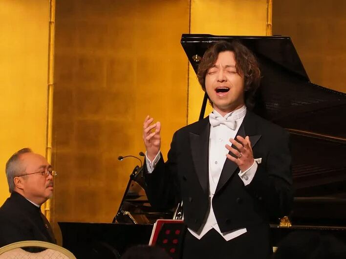 厳かな雰囲気の中、燕尾服で登壇した三浦さんは深々と一礼し、世界的に有名なベトナム人ピアニスト、ダン・タイ・ソン氏のピアノ、NHK交響楽団の大宮臨太郎氏のバイオリンにあわせ、上皇さまが作詞、上皇后さまが作曲された「歌声の響」を情感たっぷりに披露しました。