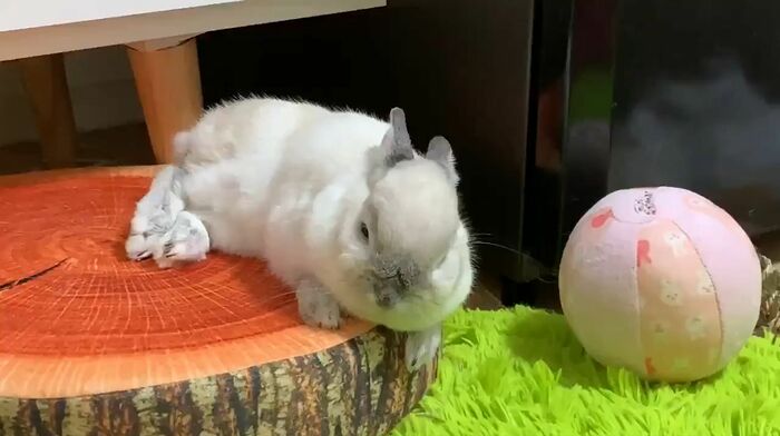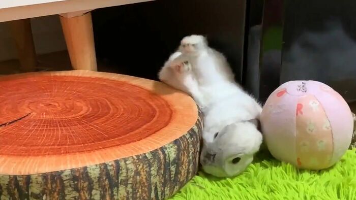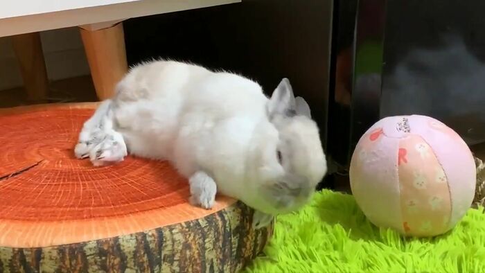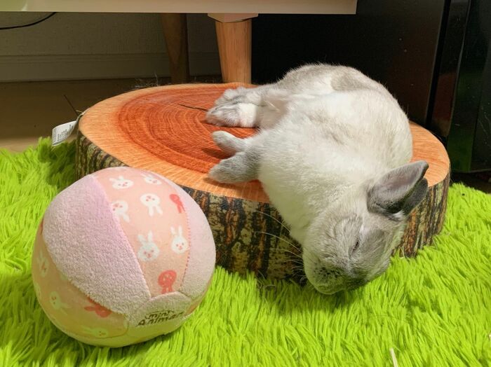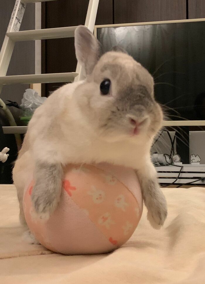うさぎ柄が描かれたボールの上に乗ったりと遊ぶことも大好きなおこげちゃん。