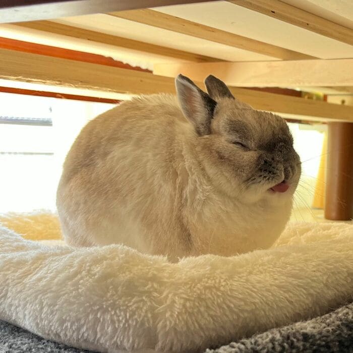 フワフワの毛布の上にちょこんと座りながら、舌を出して寝たりもしています。