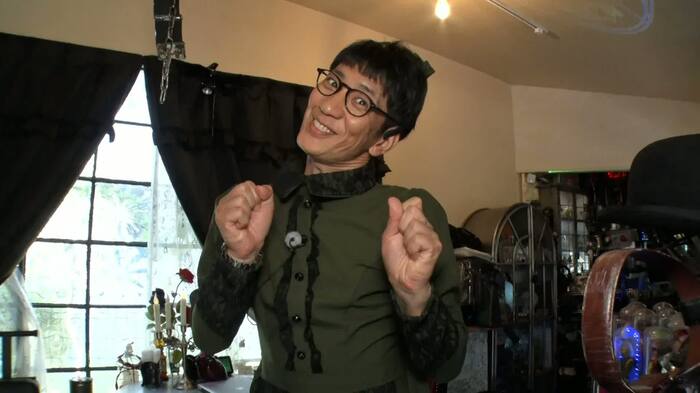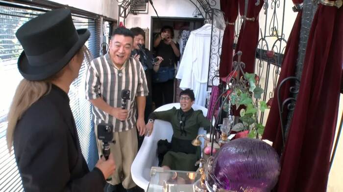 おそるおそる中に入ると、家主だという長髪にメガネ姿の独特な雰囲気の男性がお出迎え。家の中を案内してもらうと、おどろおどろしい雰囲気の室内に、手作りの人形や棺桶風のクローゼットなどのコレクションや、外から丸見えの猫足のバスタブなどが。