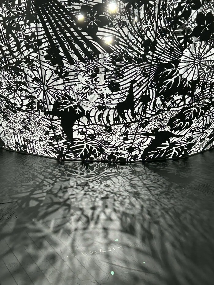 会場に入った瞬間、まず「うわ、これ何?」と光る壺の大きさに驚き、そこから両方の壁、天井、床に光と影が映し出されていることに気づき、空間全体が醸し出すスケール感に圧倒されます。