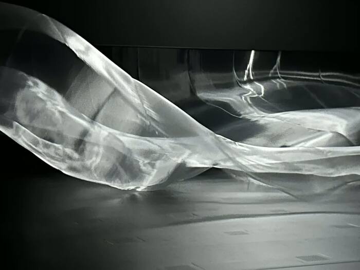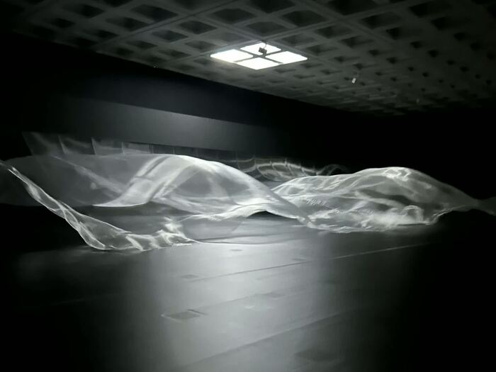 ゴーっという送風機の音だけが響くなか、薄いポリエステルの布は寄せては返す波のようにひらひらとしています。布は軽やかでも、暗闇という空間と機械音でずっしりとした重みを感じ、何とも言えない体感です。