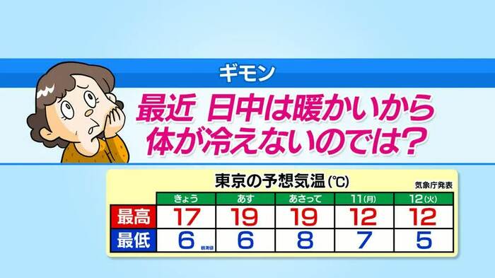 まず紹介されたのは、「日中は暖かい日が多いので、体は冷えないのでは?」という疑問です。