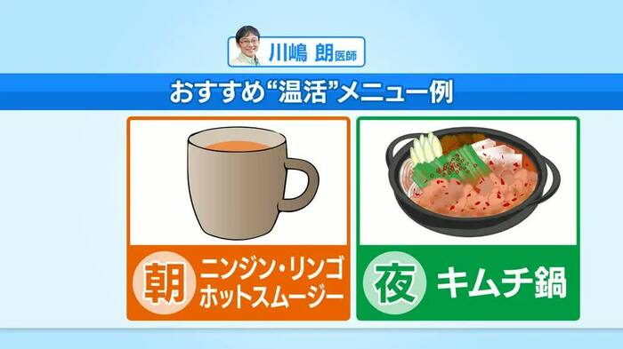 こういった食材を効果的に摂ることができるオススメ温活メニューは、「キムチ鍋」や「ニンジン・リンゴホットスムージー」。