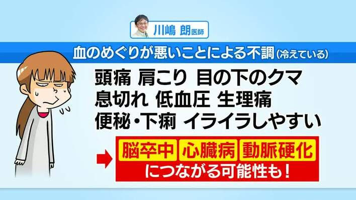 川嶋医師は「冷えると血液の温度が下がり、血の巡りが悪くなるので、代謝も免疫も落ちてしまう。体が冷えると血液は酸素を手放したがらなくなるのだが、そうすると酸素を送り続けることが予防につながるガンも防ぎづらくなり、大病につながることもある」と、冷えの怖さについて語りました。