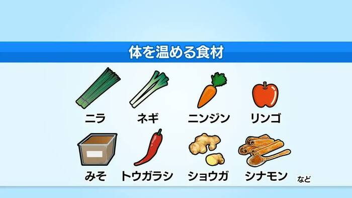 冷え性対策に効果的な食材には、匂いの成分が代謝をアップさせる効果がある「ニラ」や「ネギ」、食物繊維を多く含む「ニンジン」「リンゴ」、発酵食品の「みそ」、熱を作る「トウガラシ」や血行を良くする「ショウガ」、血管を強くする力を持つ「シナモン」「ルイボスティー」などがあるそうです。