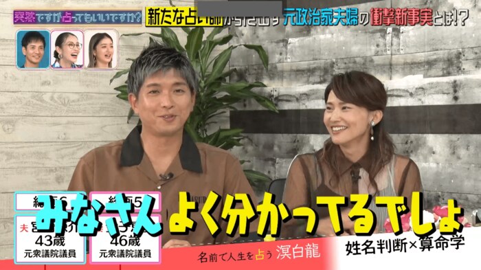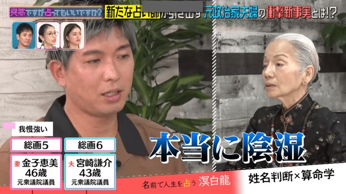 今回の『突然ですが占ってもいいですか?』は、元衆議院議員の宮崎謙介さん、金子恵美さん夫妻が、番組初登場の占い師・溟白龍(めい・はくりゅう)さんに占われました。