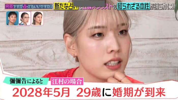 彌彌告さんは「2028年5月頃、29歳に婚期到来。出会うとしたら2027年8月」と告げました。さらに「江村さんは恋愛で見ると、中身が男」と診断すると、江村選手は「そうだと思います」とニッコリ。