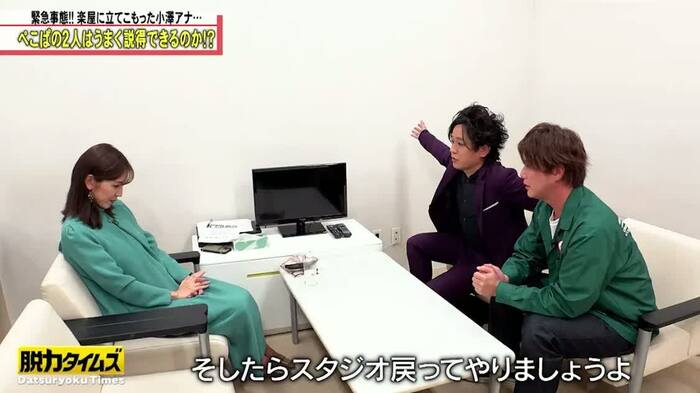 松陰寺さんは、楽屋を訪れ「一緒にスタジオに戻って盛り上げていきませんか?」「何か嫌なことがあったら言ってください。すべて僕が前向きに返します」と提案するも、小澤アナはうつむいたまま。