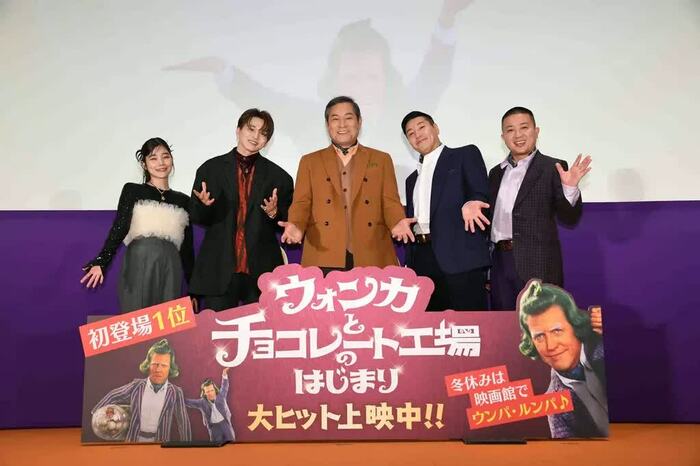 12月19日、映画「ウォンカとチョコレート工場のはじまり」の大ヒット舞台挨拶が行われ、花村想太さん(Da-iCE)、セントチヒロ・チッチさん、松平健さん、チョコレートプラネット(長田庄平さん、松尾駿さん)が登場しました。