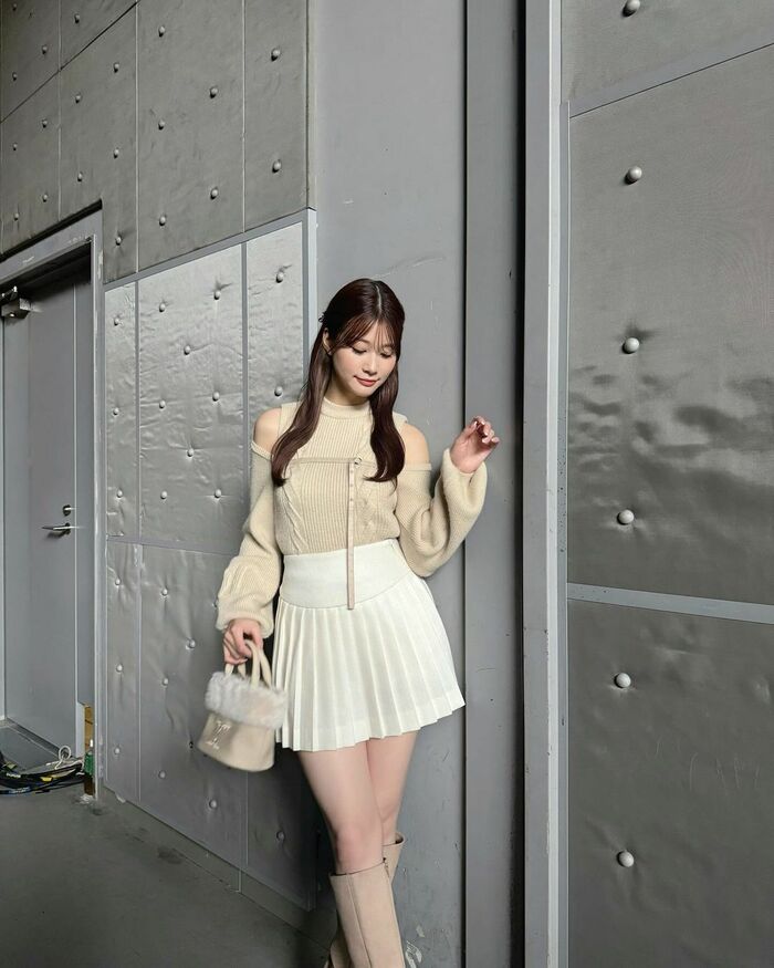 ベージュの肩出しトップスに白のプリーツスカートを合わせ、ベージュのロングブーツを履いた美脚際立つキュートコーデなど!