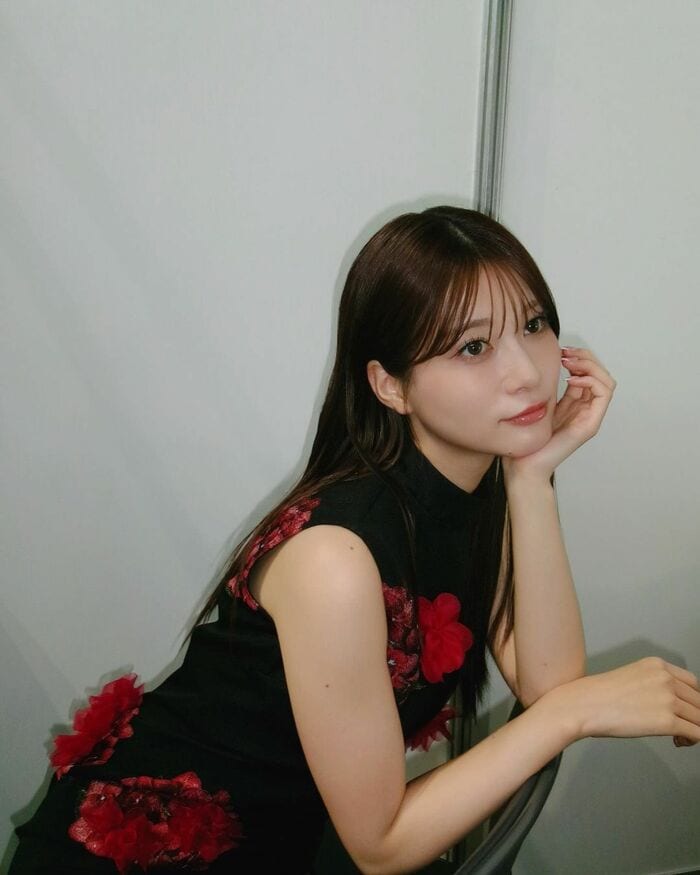 さらに、赤のインナーに黒のジャケットを羽織り、深いスリットが入ったグレーのロングスカートを合わせた大人っぽいコーデも公開しました。
