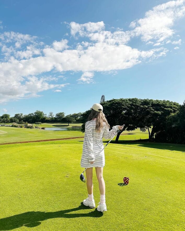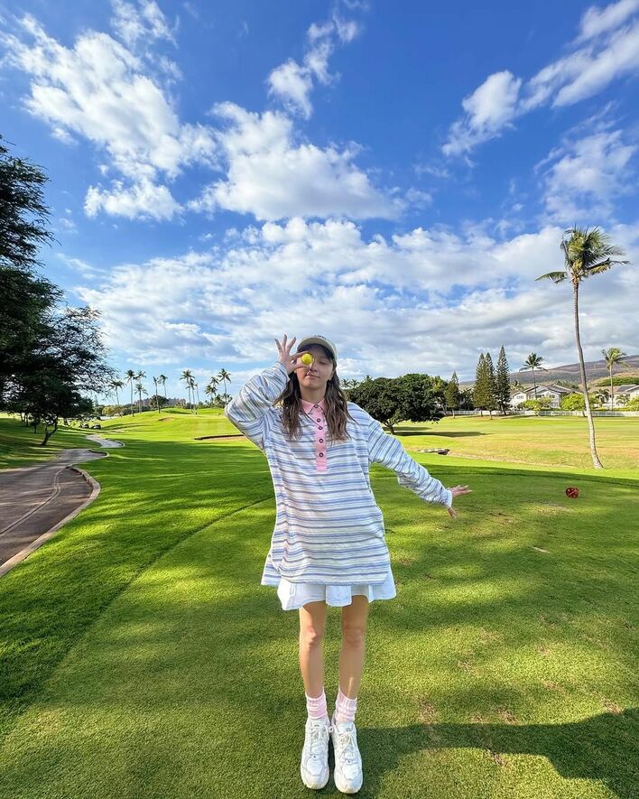 写真を見ると、キャップをかぶり、淡い色のボーダー柄のロングシャツにミニスカートを合わせたゴルフウェア姿を披露。青空の下、ゴルフグラブを持ってポーズをきめる、バックショットや…